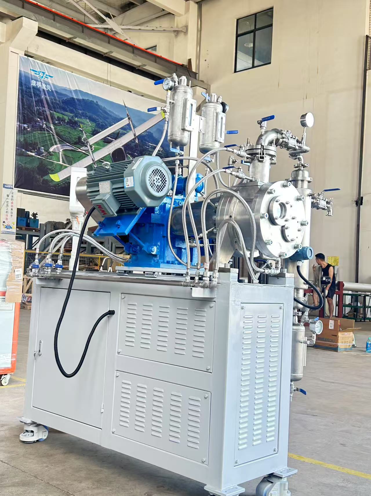 為了適應(yīng)在真空狀態(tài)下的操作,專門安裝了適用于高粘度物料的齒輪泵式出料器。該出料器直接安裝在主設(shè)備上,消除了設(shè)備內(nèi)的死角。齒輪泵式出料器在稍微超負(fù)荷的條件下工作,以保證物料能連續(xù)地排出,并輸入下一工段進(jìn)行包裝。