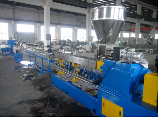 雙螺桿擠出造粒機(jī)工藝;原料稱(chēng)重----配比----高混機(jī)----螺旋自動(dòng)上料機(jī)----雙螺桿造粒機(jī)-------冷卻水槽-------吹干機(jī)-------切粒